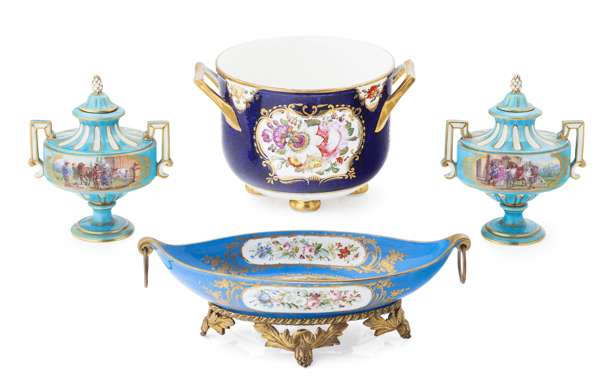 comprising a Sevres navette shaped dish painted with a romantic couple against a blue ground, on a gilt metal base, printed marks, 28.5cm wide; and a pair of Sevres-style covered urns, with pseudo blue marks, 17cm high; together with an ENGLISH PORCELAIN JARDINIÈRE, painted with floral reserves against a cobalt ground, 14.5cm high (4)