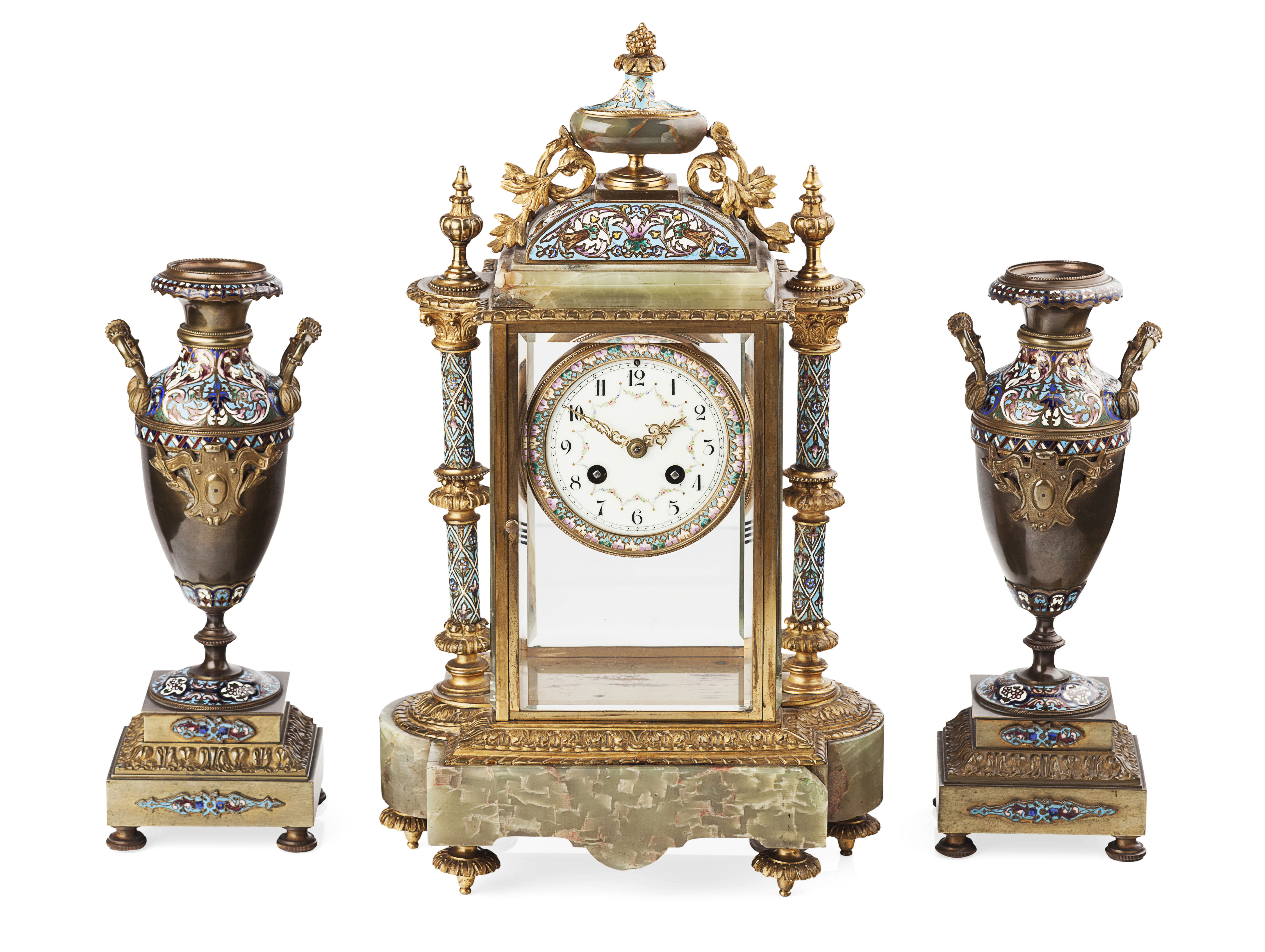 the four glass case clock in a brass and onyx frame decorated with champlevé enamels, flanked by a pair of gilt metal mounted urns similarly enamelled (3)