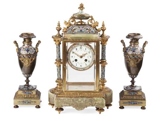 FRENCH ONYX AND CHAMPLEVÉ ENAMEL CLOCK GARNITURE