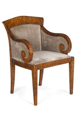 BEIDERMEIER BURR WOOD AND UPHOLSTERED ARMCHAIR