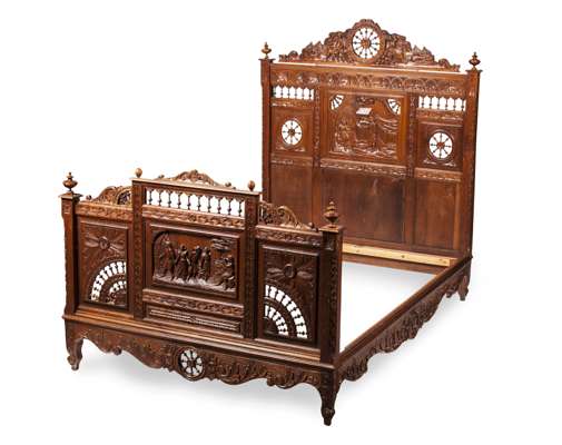 the head and footboards with carved panels depicting rural figures in a country setting, with spindled details