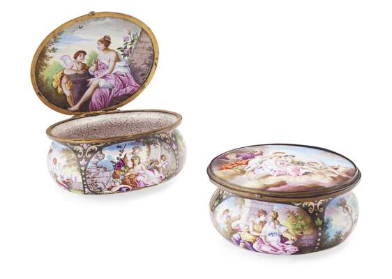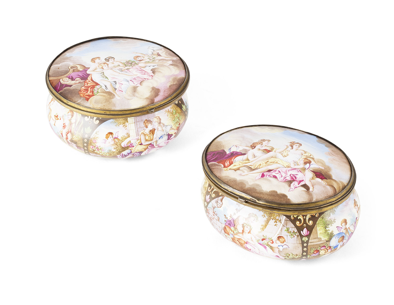 decorated with reserves depicting Venus and Cupid accompanied by maidens within painted borders, with gilt metal mounts; one oval, the other circular (2)