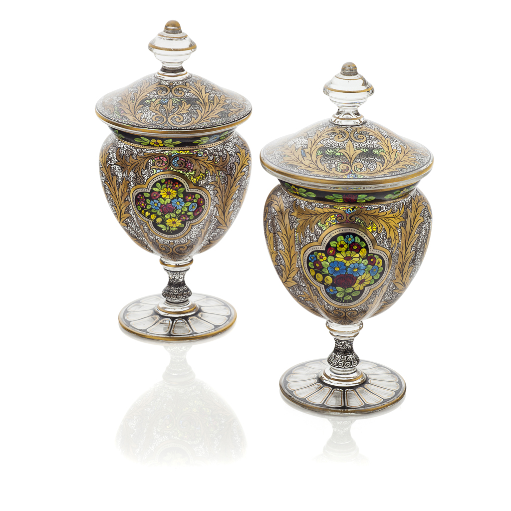 PAIR OF JULIUS MUHLHAUS PAINTED AND GILT GLASS COVERED JARS