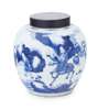 of typical ovoid form, decorated with a figure upon a mythical beast and attendants, with blue double ring marks, but later, with an associated hardwood cover