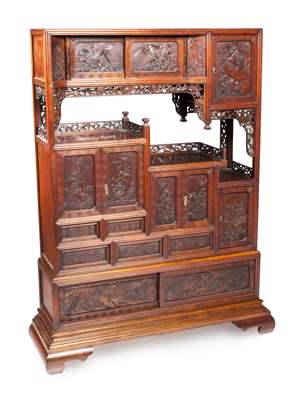with an arrangement of cupboard doors, sliding compartments, drawers and galleried shelves, carved allover with eagles, geese, songbirds, chrysanthemums, and ho-ho birds, on a moulded base with scroll feet; the doors mounted with mixed metal handles