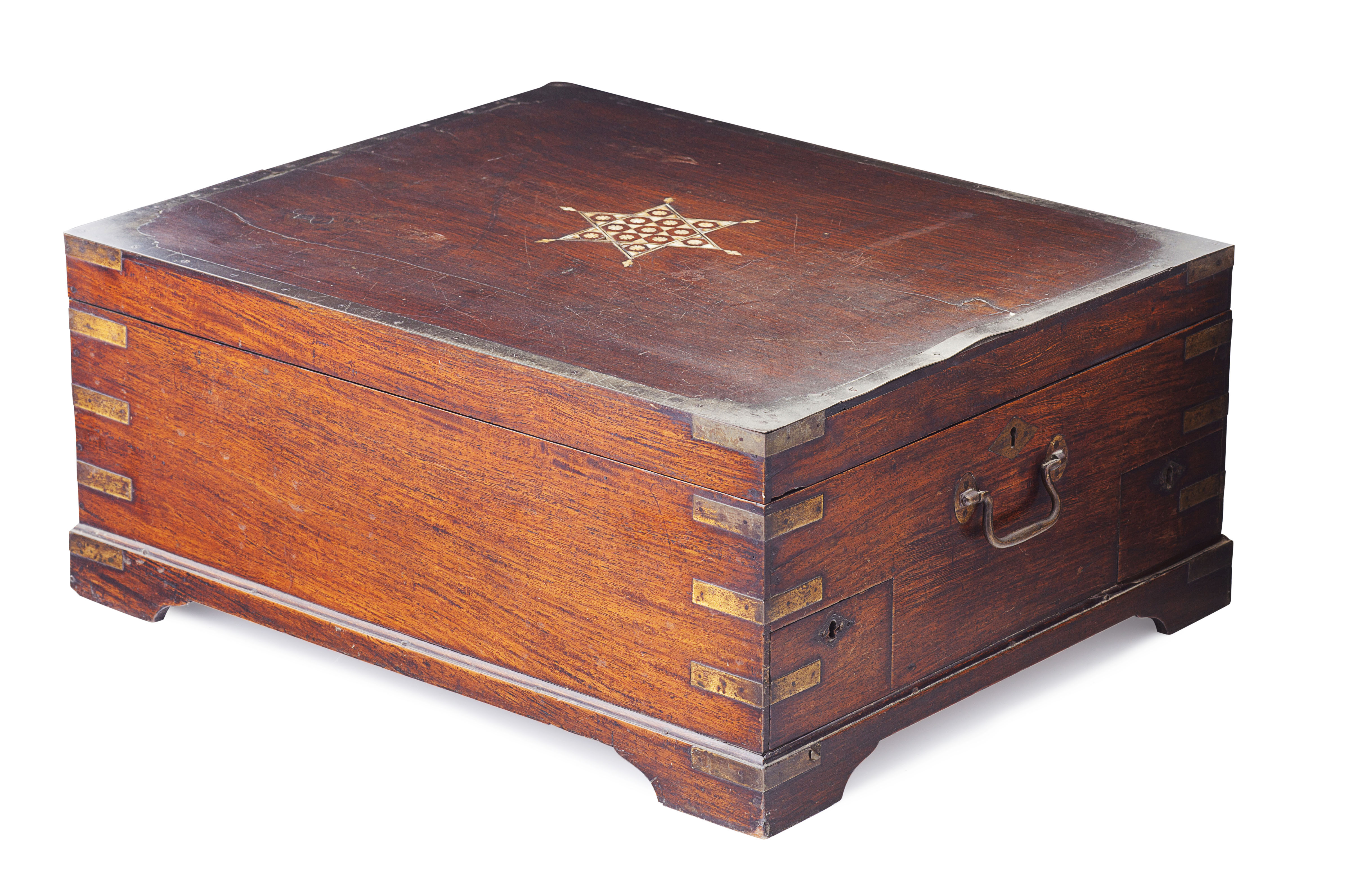 the brass banded hinged lid centred by a mother-of-pearl star motif, opening to a compartmented interior fitted with a recessed well and secret compartments, with two external drawers and metal handles