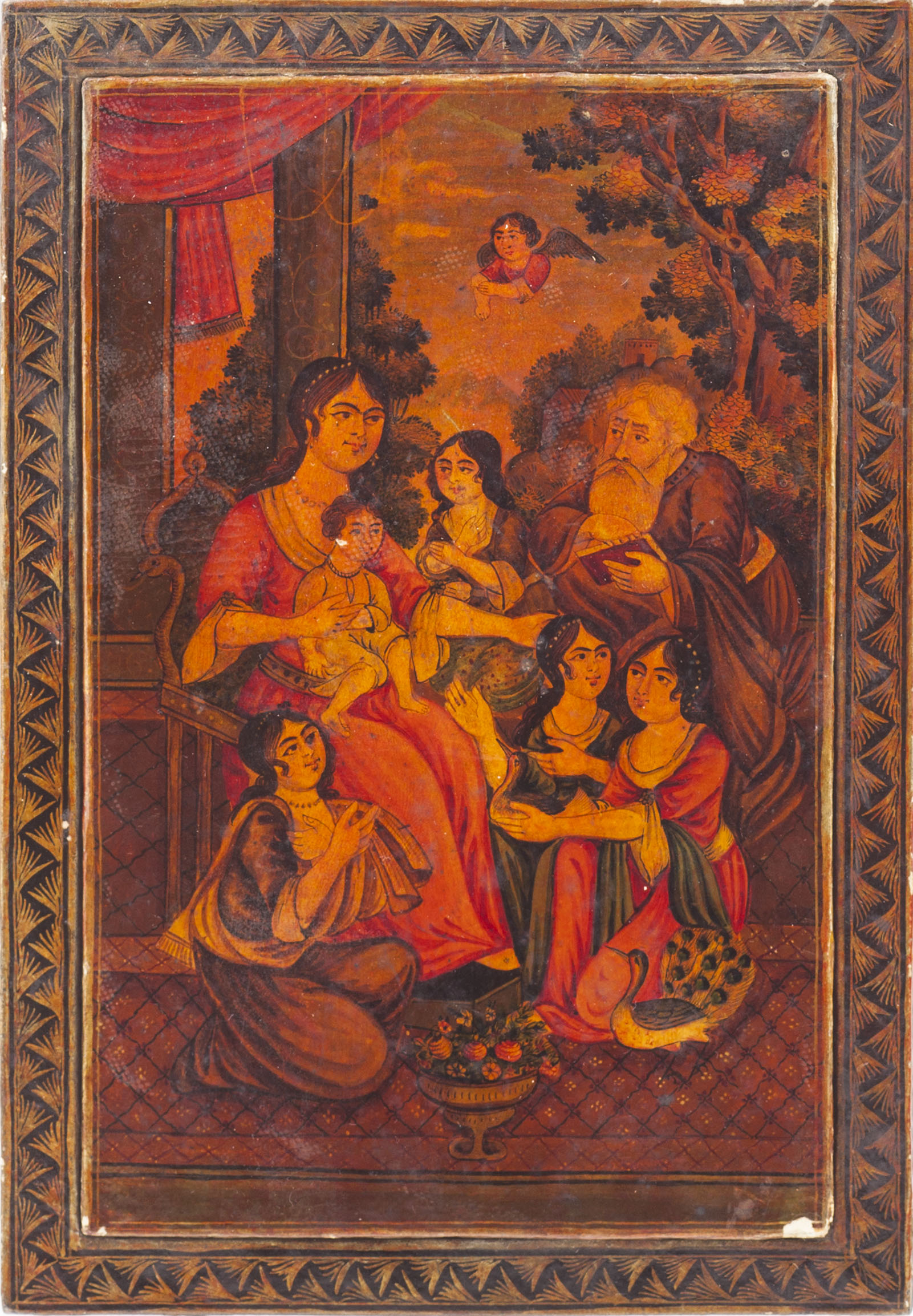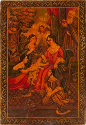 the front and back panels decorated with Christian scenes of the Holy Family