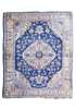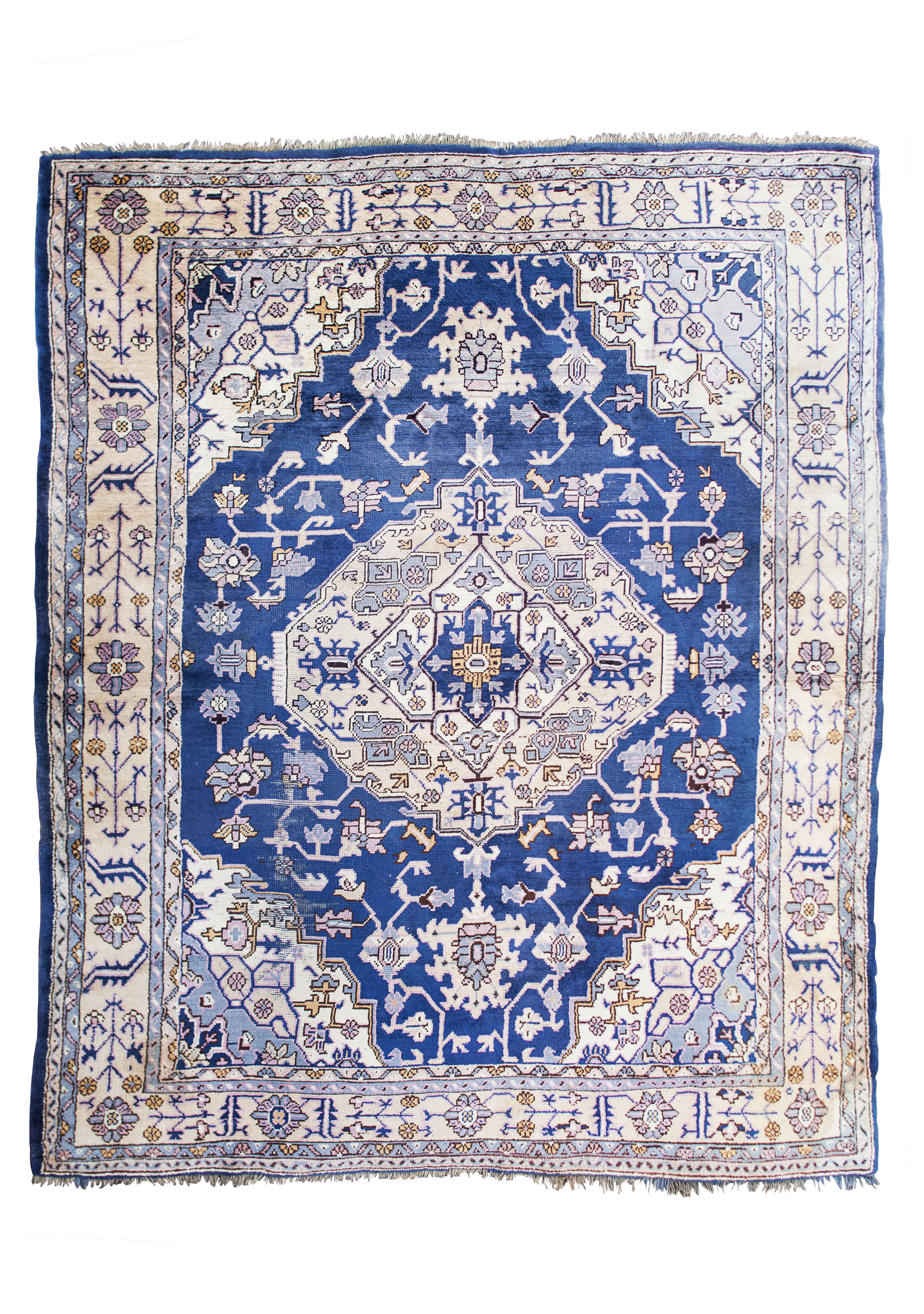 the indigo field with camel hexagonal medallion, cream and blue spandrels, within camel rosette and foliate border between blue and grey bands