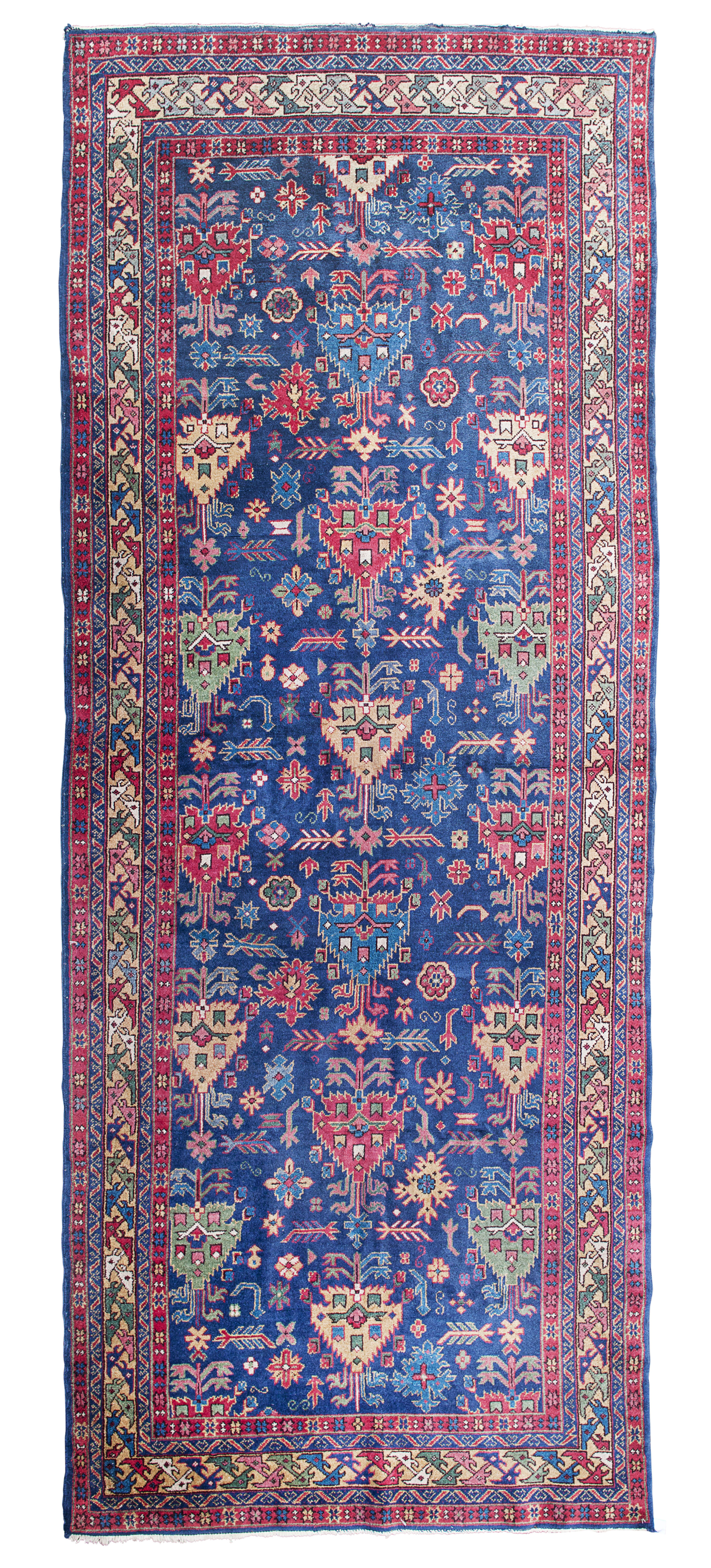 of Kuba design, the indigo field with arrowhead palmette and foliate pattern, within camel geometric border between red and blue bands