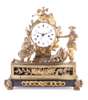 the circular white enamel dial with Roman and Arabic number in a drum case flanked by oak leaves and surmounted by a putto, the rectangular base with figures of Henry IV of France and the Duc de Sully, the eight day movement striking a bell and signed 'Du Pasquier A Paris'; the base concealing a musical movement, raised on paw feet