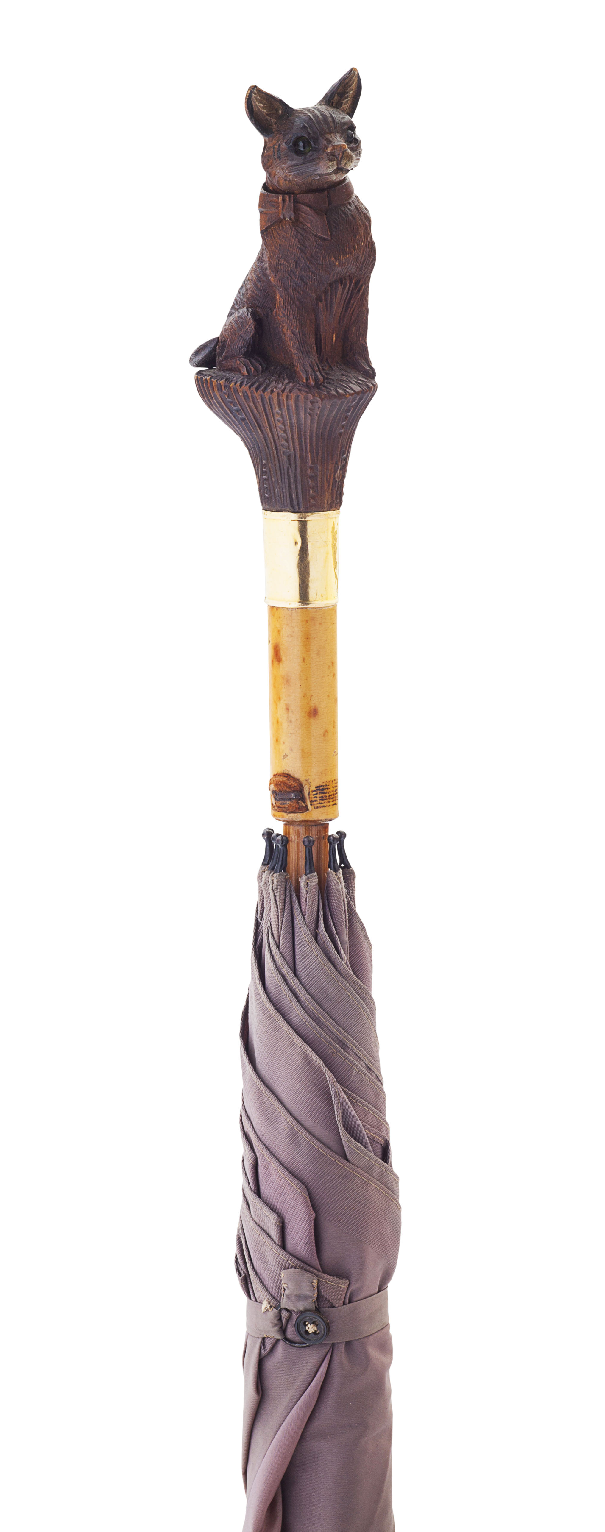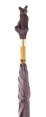 the handle carved as a seated cat with moving head and tail when a button is pushed, above a gold collar and bamboo shaft with a taupe silk parasol