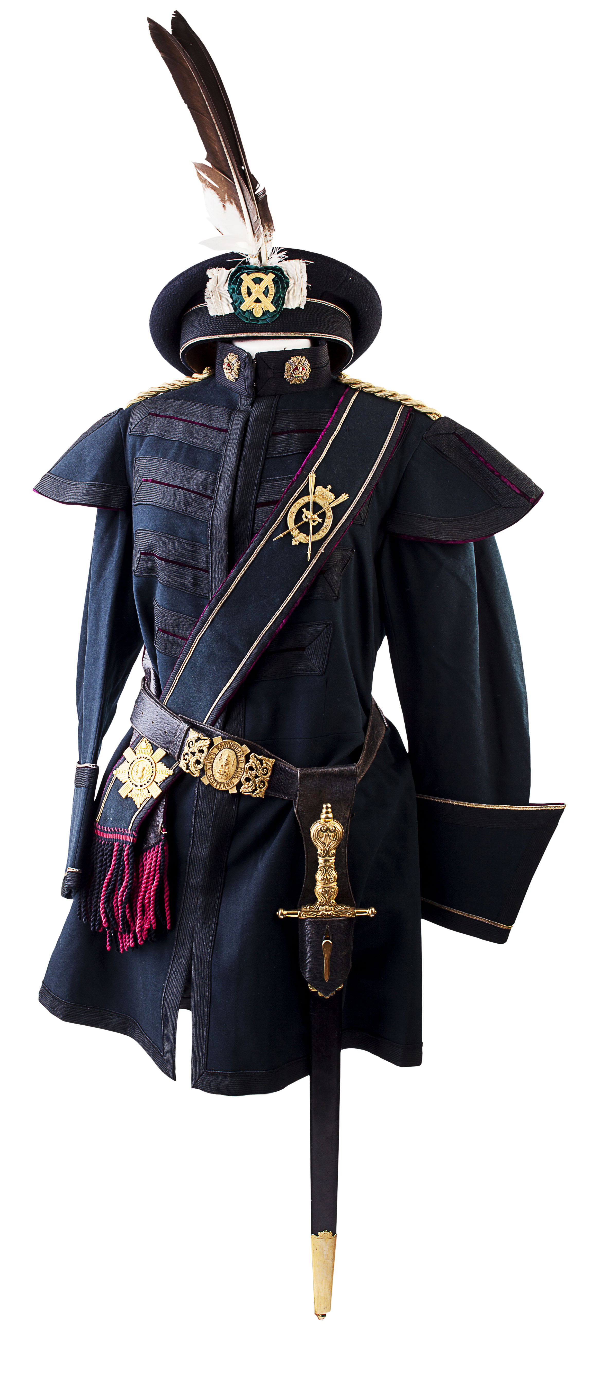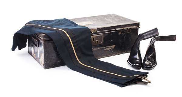 comprising of: a tunic with major's badge of rank, a pair of trousers, with a sash, a Roman sword, and sword belt, cape and a leather cape sling, two bonnets, a pair of boots (size 6), and an evening tail coat with a velvet collar, with two eagle feathers, two arrows, contained in a military tin trunk with brass plaque engraved MAJOR F. J. CARRUTHERS OF DORMONT (qty)