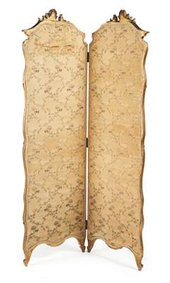 comprised of two panels of rococo design with mirror glazed panels divided by scrolled bars, the bases carved with baskets of flowers