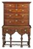 the moulded cornice over two short and three long graduated drawers; the separate stand with a brushing slide and three short drawers above a shaped apron, raised on baluster turned legs joined by a wavy peripheral stretcher raised on squat bun feet