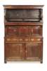 the moulded cornice above an open space with display shelf over three arched panel cupboard doors; the lower part with three frieze drawers above a pair of arched panel cupboard doors, raised on stile feet
