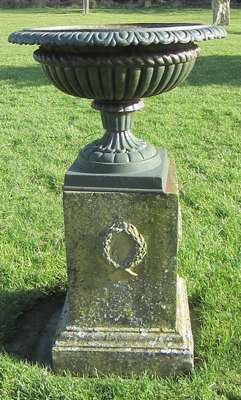 CAST IRON GARDEN URN AND FIRE CLAY PLINTH