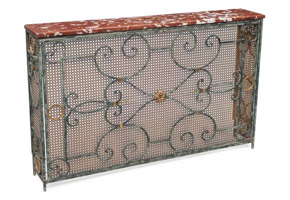 PAIR OF WROUGHT IRON MARBLE TOPPED RADIATOR COVERS