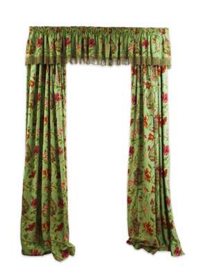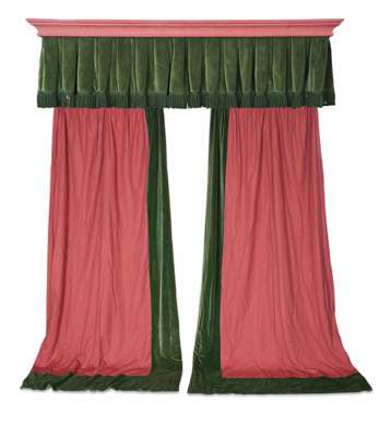THREE PAIRS OF RED LINEN AND GREEN VELVET CURTAINS AND PELMETS