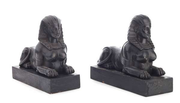PAIR OF PATINATED METAL FIGURES OF SPHINXES