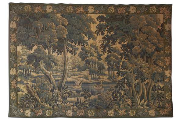 in the 17th century style, depicting a pair of geese on a river in a wooded landscape, within a floral border, with a label to verso for Point de L'Halluin