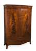 the bowfront arch moulded cornice above a pair of doors with oval panels with boxwood stringing opening to hanging space, over a single base drawer, raised on splayed feet