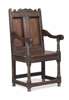the scroll carved crest rail above a recessed double panel back and plank seat flanked by scroll arms, raised on turned column legs joined by peripheral stretchers