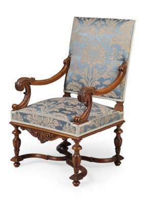 the upholstered back and seat in blue and yellow damask, the walnut scrolling arms with leaf carved terminals, on carved baluster legs joined by a shaped X-form stretcher