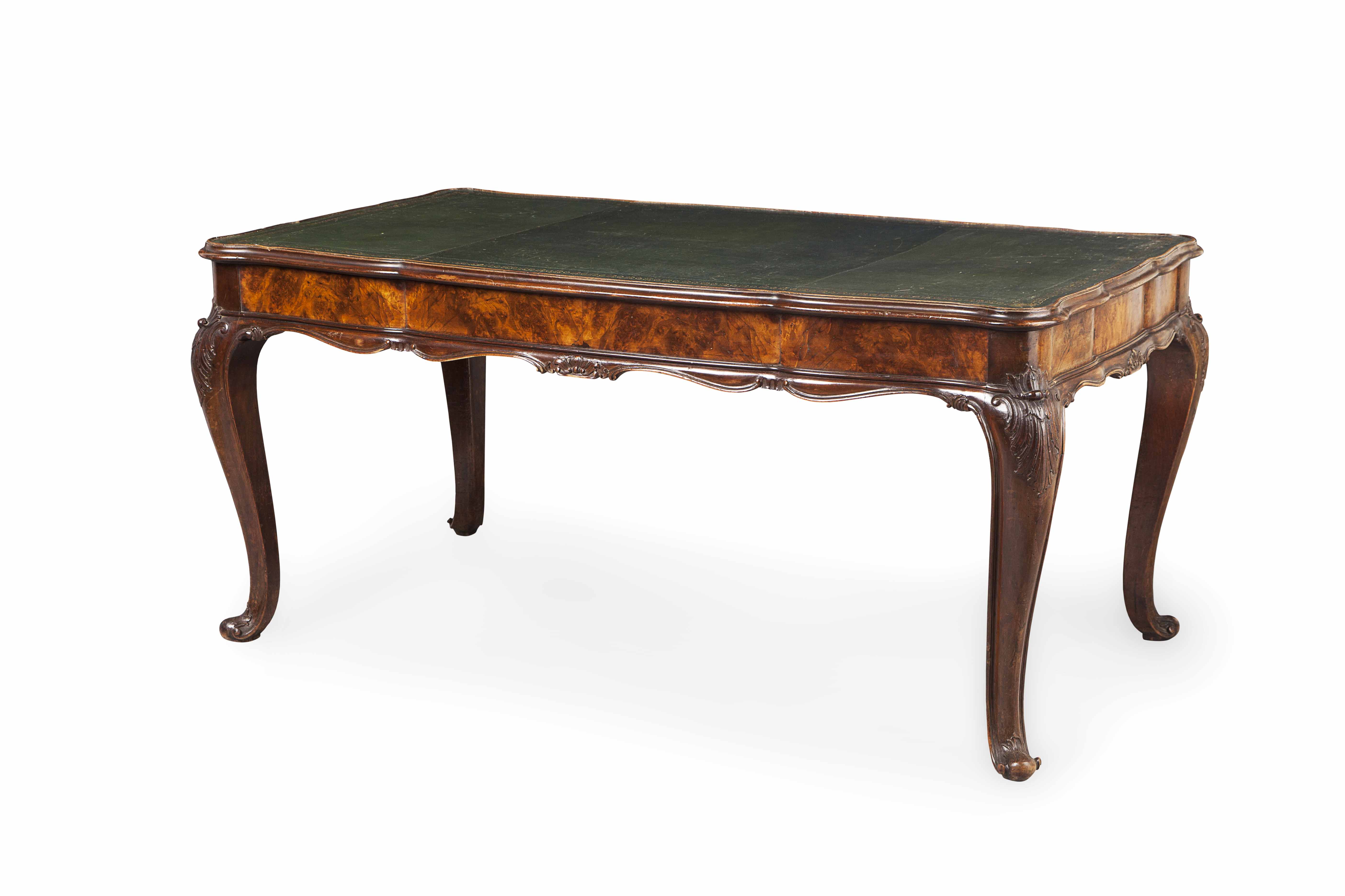 the shaped rectangular top with a gilt tooled leather insert, above a deep frieze with lateral drawers, raised on leaf carved cabriole legs