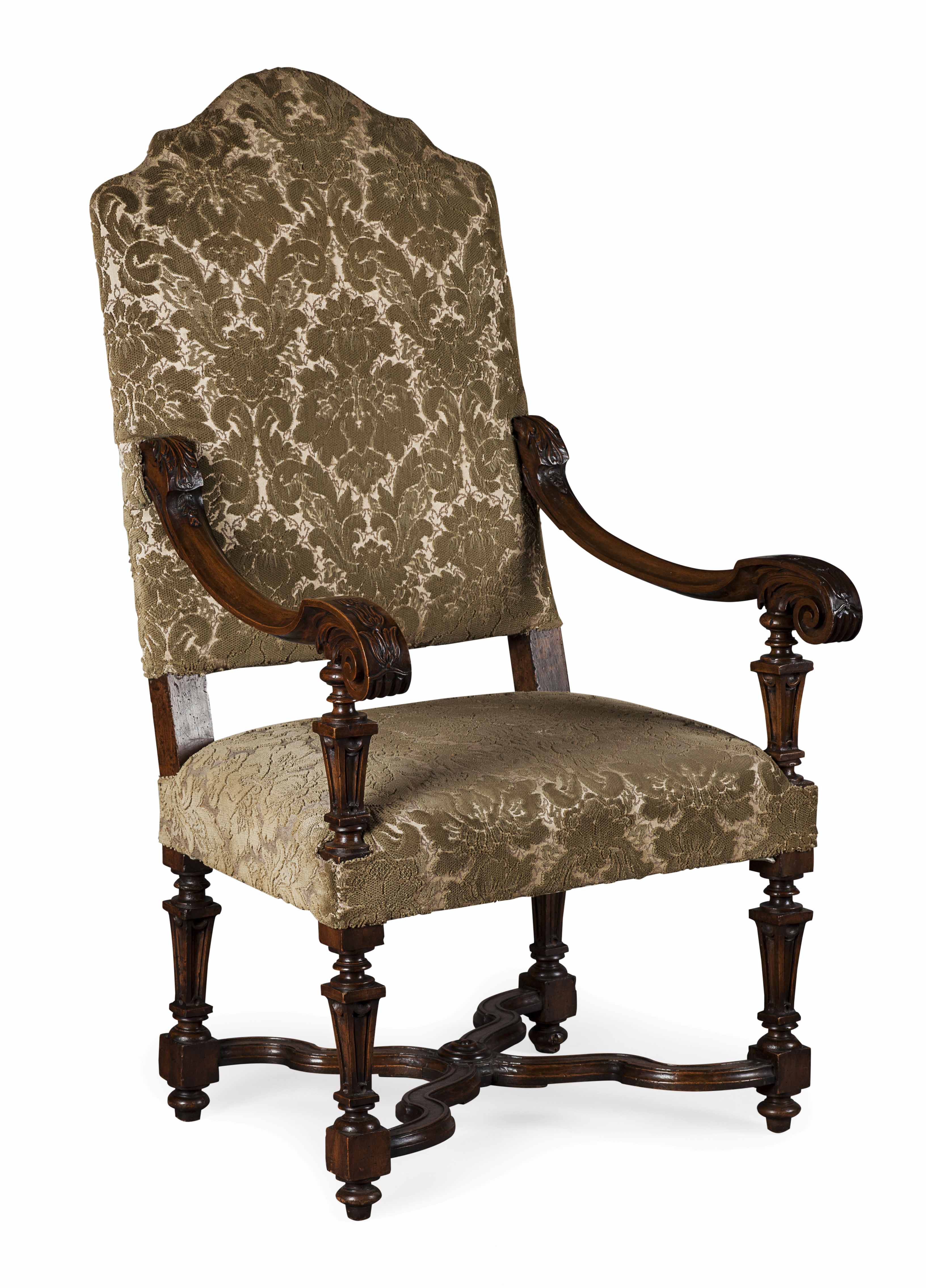 LOUIS XIV STYLE WALNUT UPHOLSTERED ARMCHAIR