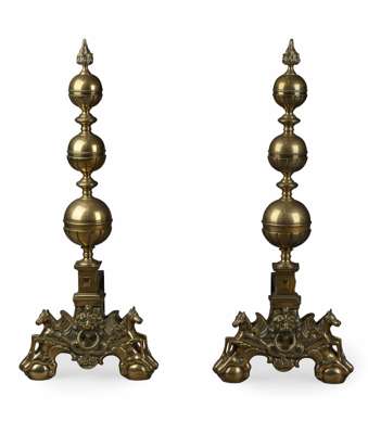 PAIR OF DUTCH BAROQUE STYLE BRASS FIRE DOGS