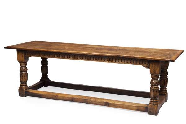 in the 17th century style, the three plank top above a carved frieze, raised on carved baluster legs with fluted details, joined by peripheral stretchers