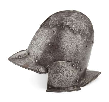 the crown with scalloped edge, large frontal rim with pierced applied decoration, two ear flaps hinged and pierced