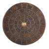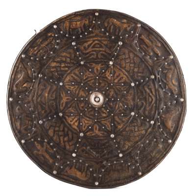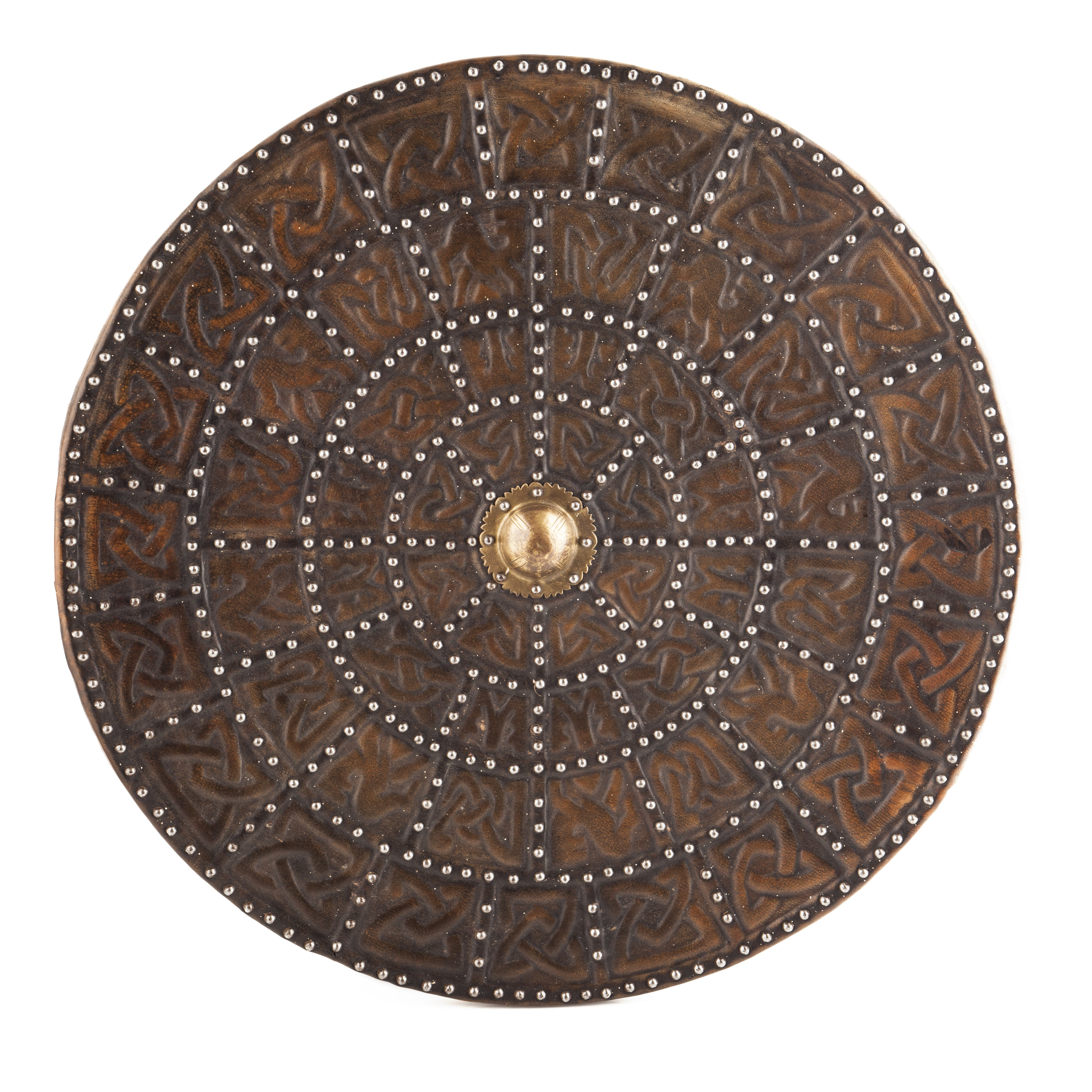 decorated with roundels, brass plates and tooled strap work, the back covered in leather and with iron grips, with a central brass boss threaded to take a spike (2)