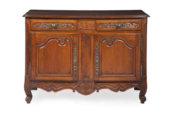 the moulded top above three short frieze drawers with steel strapwork, escutcheon and knob; over a pair of moulded cupboard doors with further steel strap work and foliate carved panel, above a shaped moulded apron and short cabriole legs with scroll feet