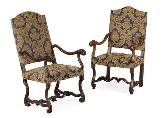 NEAR PAIR OF FLEMISH WALNUT AND UPHOLSTERED OPEN ARMCHAIRS