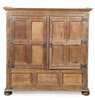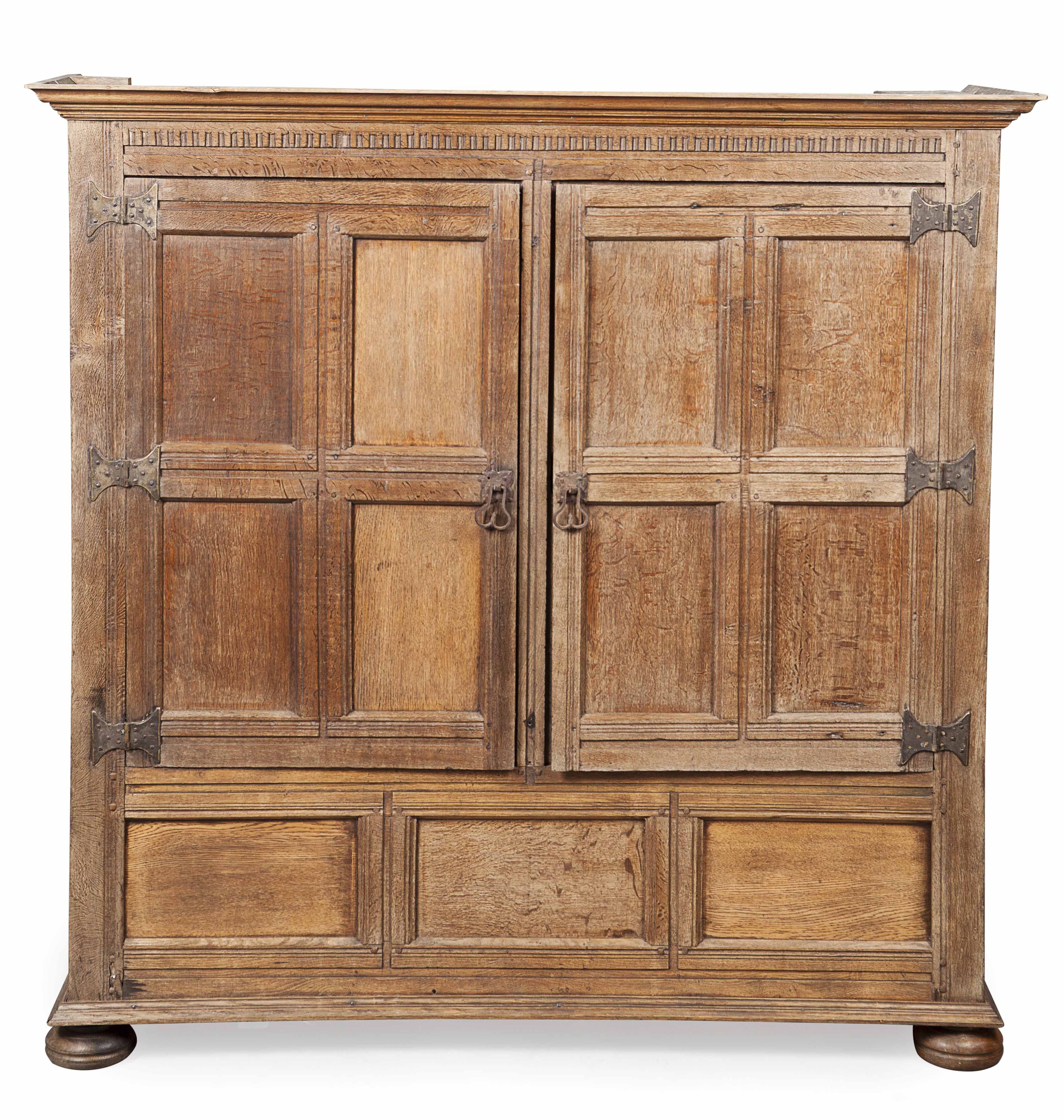 the moulded cornice above a pair of four panel doors with large metal hinges, above a triple panel base, raised on later bun feet