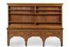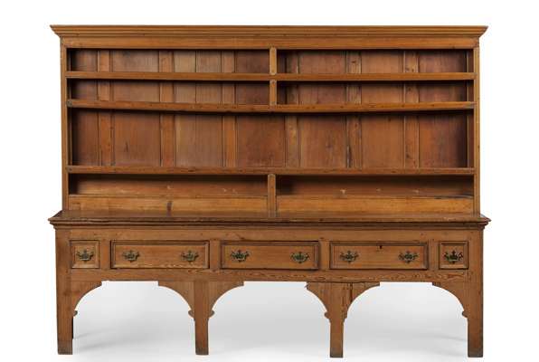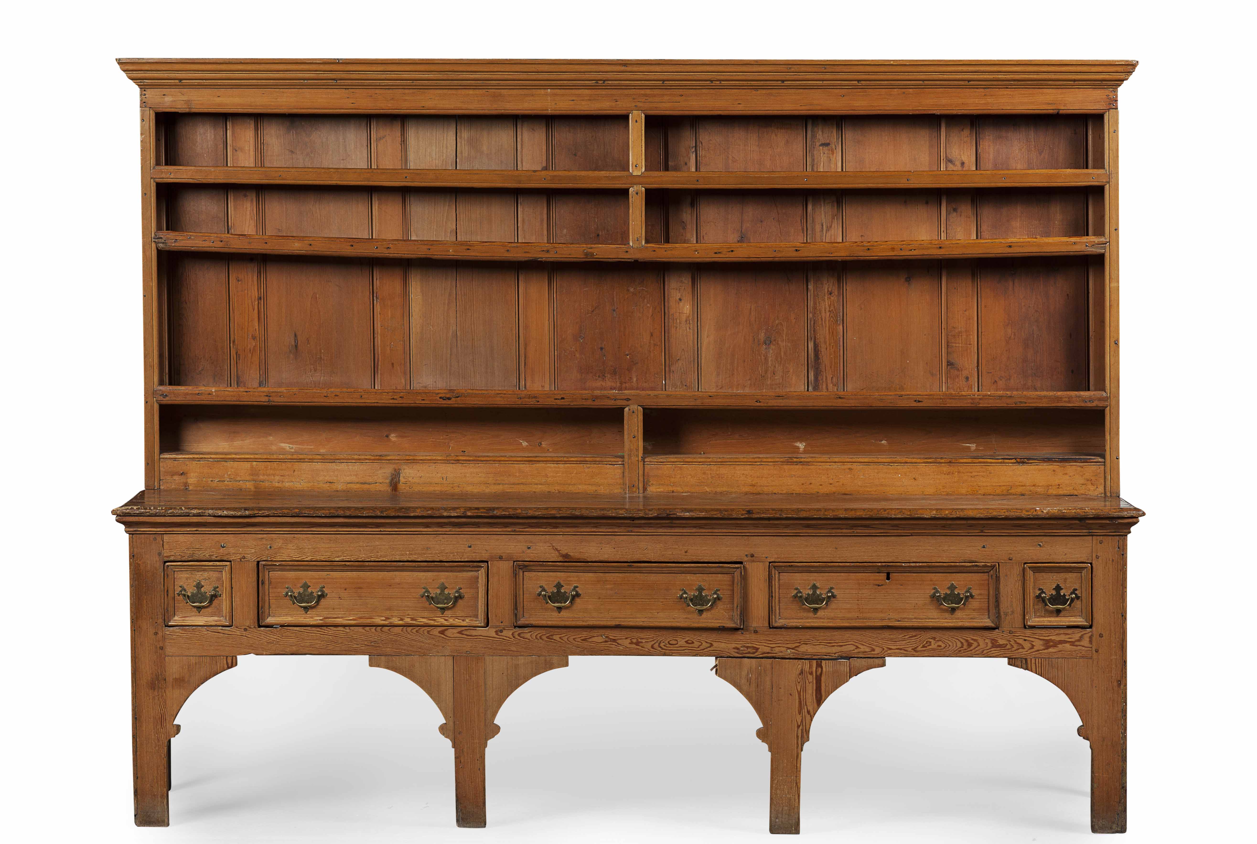 the plate rack with a moulded cornice above a plain frieze and an arrangment of shelves, with a later panelled back; the base with a moulded top above three central wide drawers and candle drawers to each side, raised on straight legs with shaped brackets