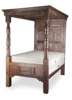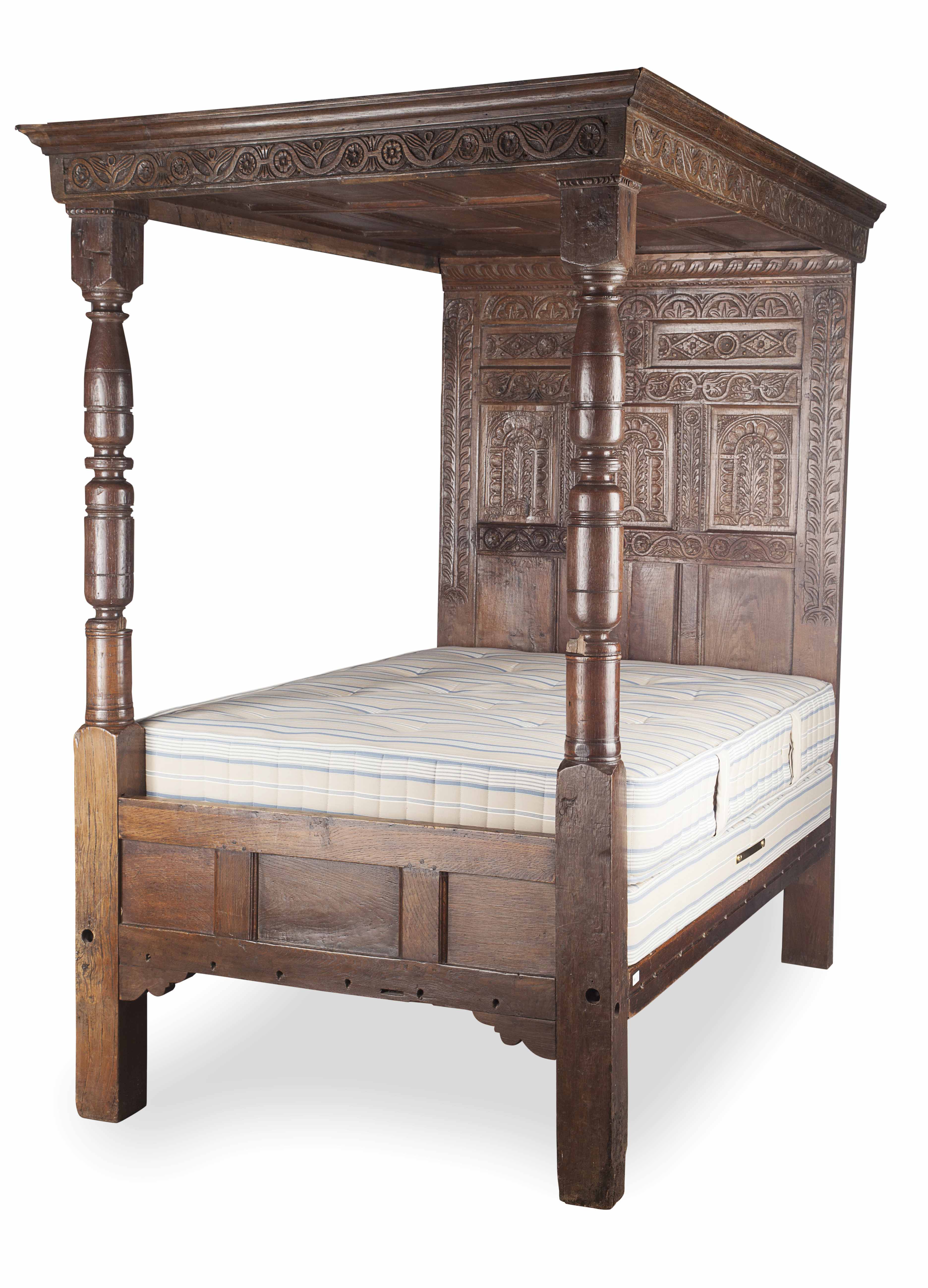 the carved cornice and panelled tester above a panelled headboard carved with stylised flower motifs and architectural niches, the plain panelled footboard with a pair of large turned column supports; with a modern base and mattress