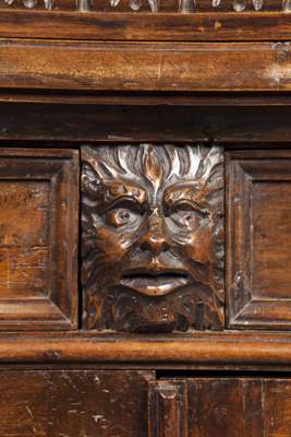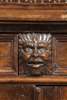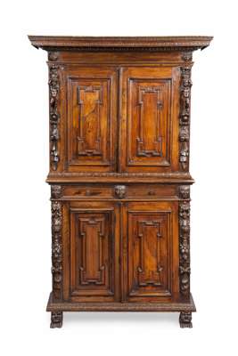the projecting cornice above a pair of moulded panel doors flanked by carved putti and foliate pilasters; the lower part with two short frieze drawers above two further doors, flanked by carved mask and fruiting foliate pilasters, raised on carved crouching animal feet