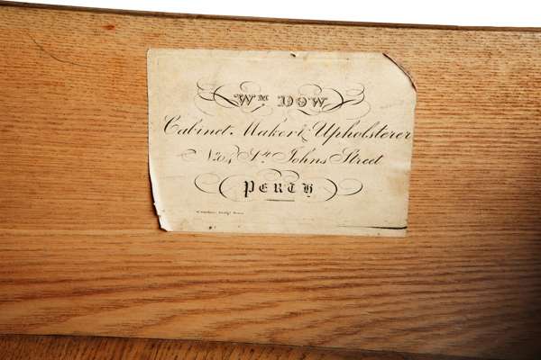 the moulded cornice above a pair of panelled doors marked at the corners with reeded mouldings and flanked by reeded half columns, opening to sliding shelves; the lower part with two short over three long drawers with lion mask handles, flanked by further half columns, raised on short block feet; one drawer with a paper trade label 'William Dow, Cabinetmaker, Upholster, no 4 St. John's Street, Perth'