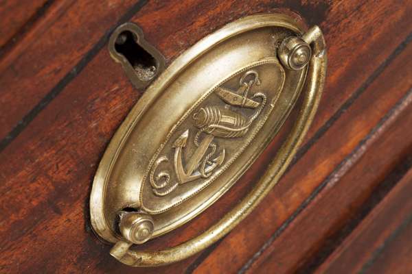 the rectangular top above three short and three long drawers outlined with ebonised stringing, the oval brass hand pulls embossed with anchors, above a shaped apron raised on bracket feet