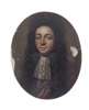 oil on metal, oval, depicting a gentleman wearing a long brown wig with a lace cravat; in a conforming metal box with a hinged cover