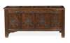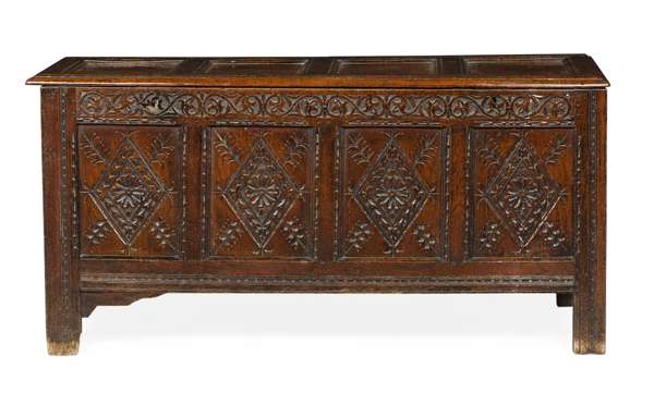 the quadruple panel hinged top above a foliate scroll carved frieze and panel front carved with geometric lozenges and scrolling foliage, raised on stile feet
