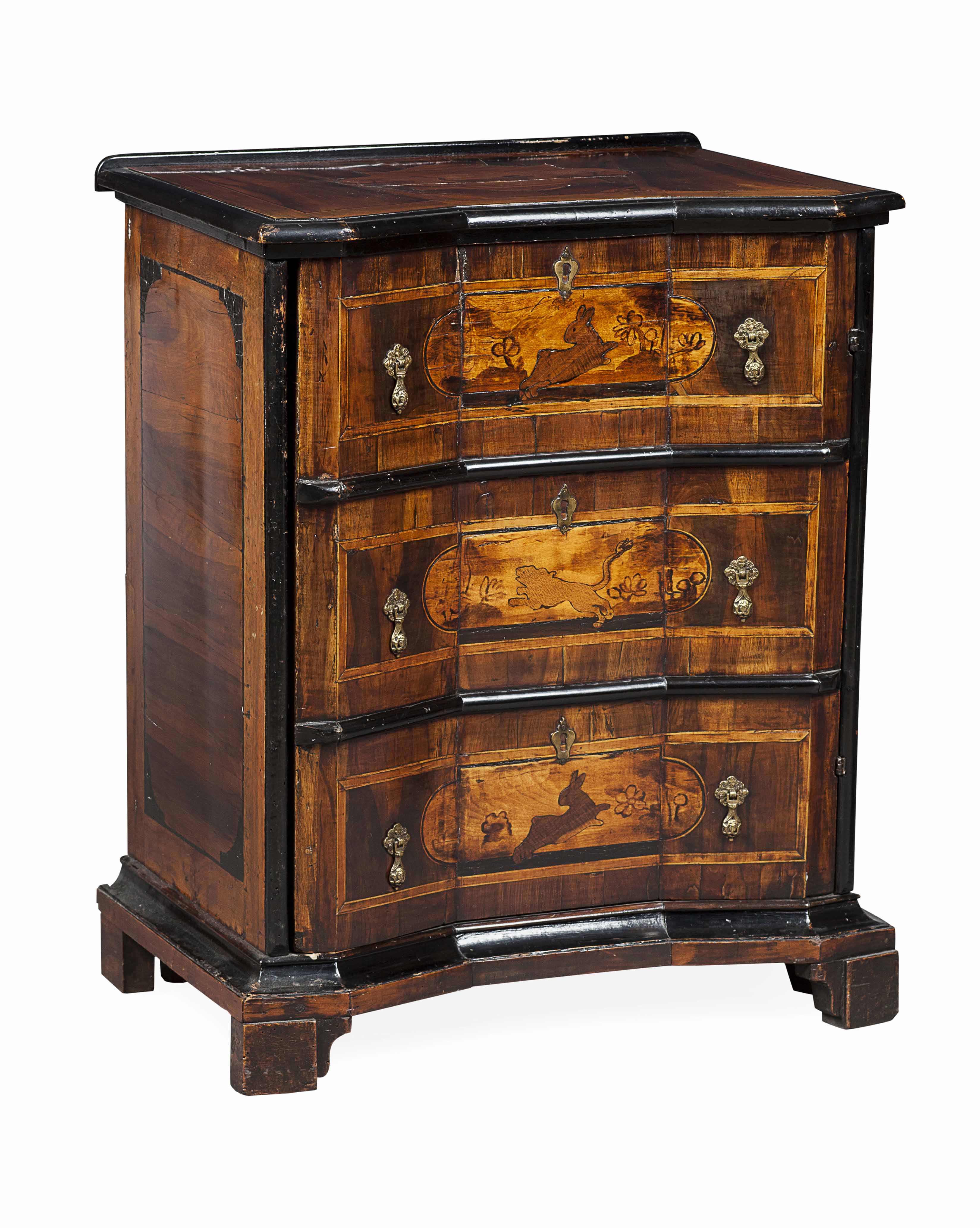 the hinged shaped top above a cupboard door disguised as three drawers with animal marquetry reserves, raised on block feet