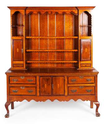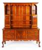 the inverted breakfront cornice above a serpentine frieze and open shelves flanked by shelves and cupboard doors; the lower part with a pair of cupboard doors flanked by banks of two short drawers, above a serpentine apron, raised on short cabriole legs ending in carved claw feet
