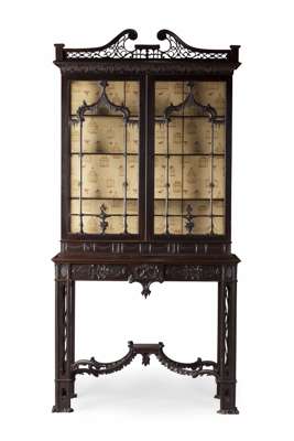 the broken swan neck fretwork pediment above a foliate carved moulded frieze and a pair of glazed doors carved with rock work, C and foliate scrolls, opening to a silk lined interior with shelves, above three short drawers to the base carved with drapery swags; the lower part with two short frieze drawers raised on openwork trellis straight legs united by a scrolled carved X form stretchers joined by a raised tier, on foliate carved feet