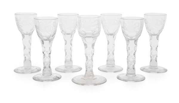 NEAR SET OF SEVEN ENGRAVED AND CUT WINE GLASSES