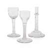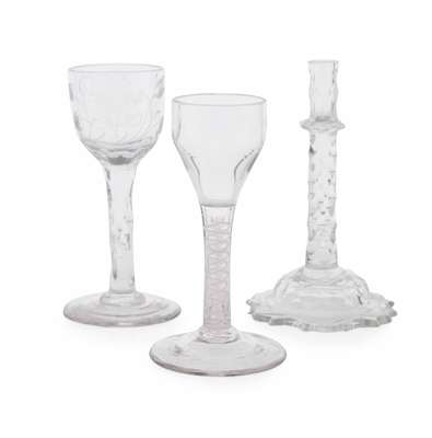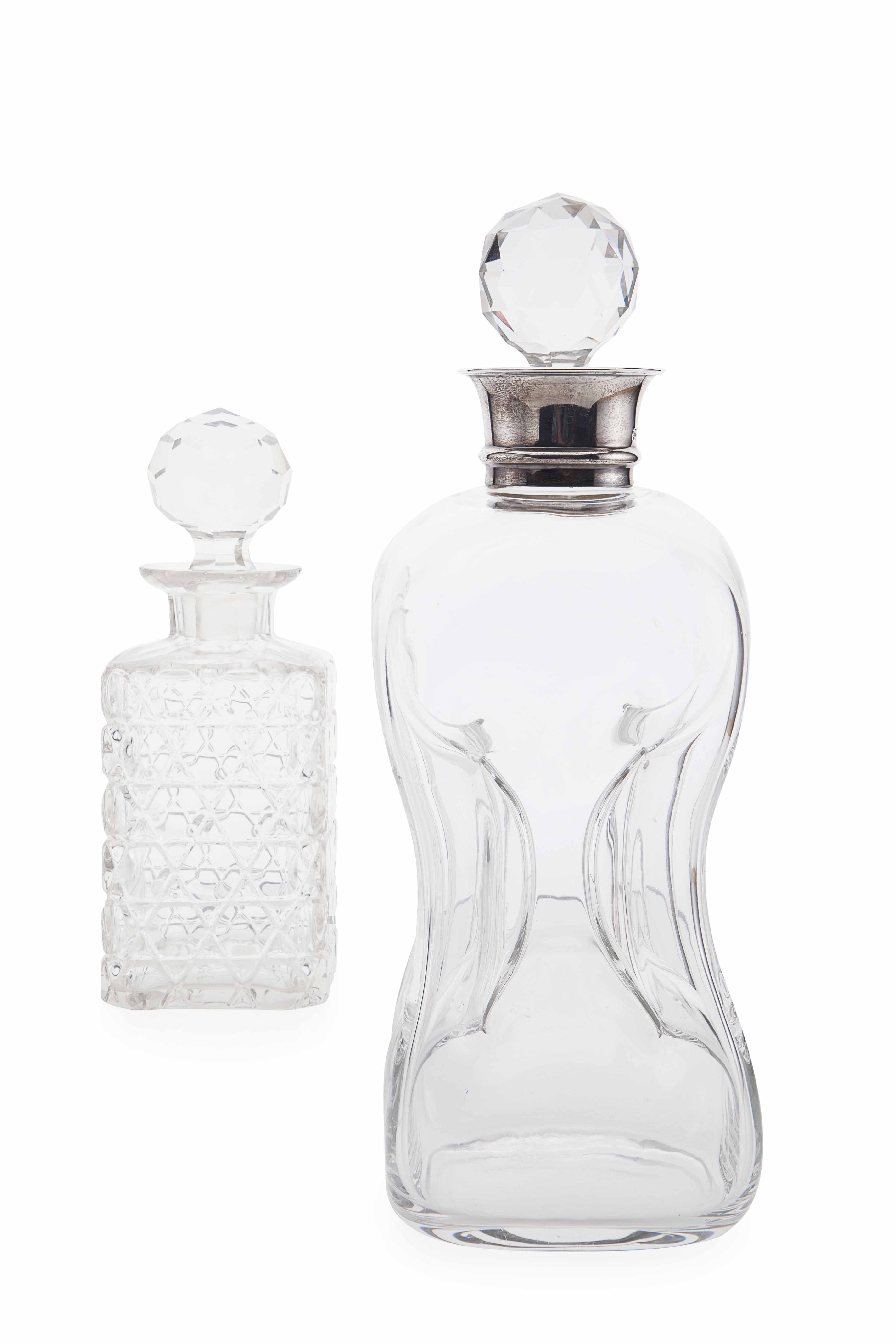 comprising a wine glass with an etched bowl and a facet cut stem, 14.5cm high; a wine glass with a double opaque twist stem, 13.5cm high; and facet cut taper stick with a domed foot, 15cm high; together with a LATE VICTORIAN SILVER MOUNTED PINCHED GLASS DECANTER, date mark 1899, 28.5cm high; and a CUT GLASS DECANTER AND STOPPER, 23cm high (5)