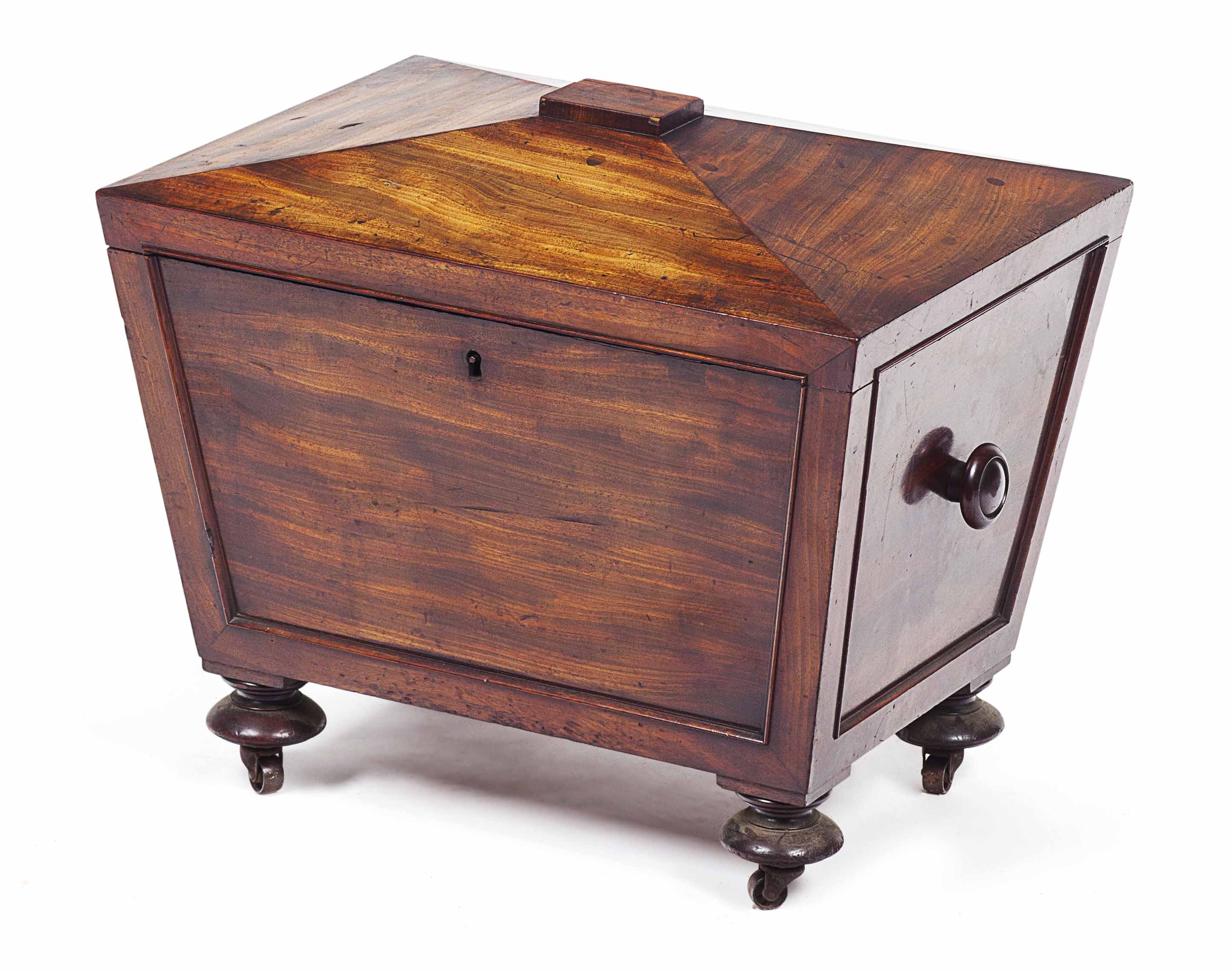 of sarcophagus form with knop handles to the sides, opening to a lined interior, raised on squat turned feet with castors