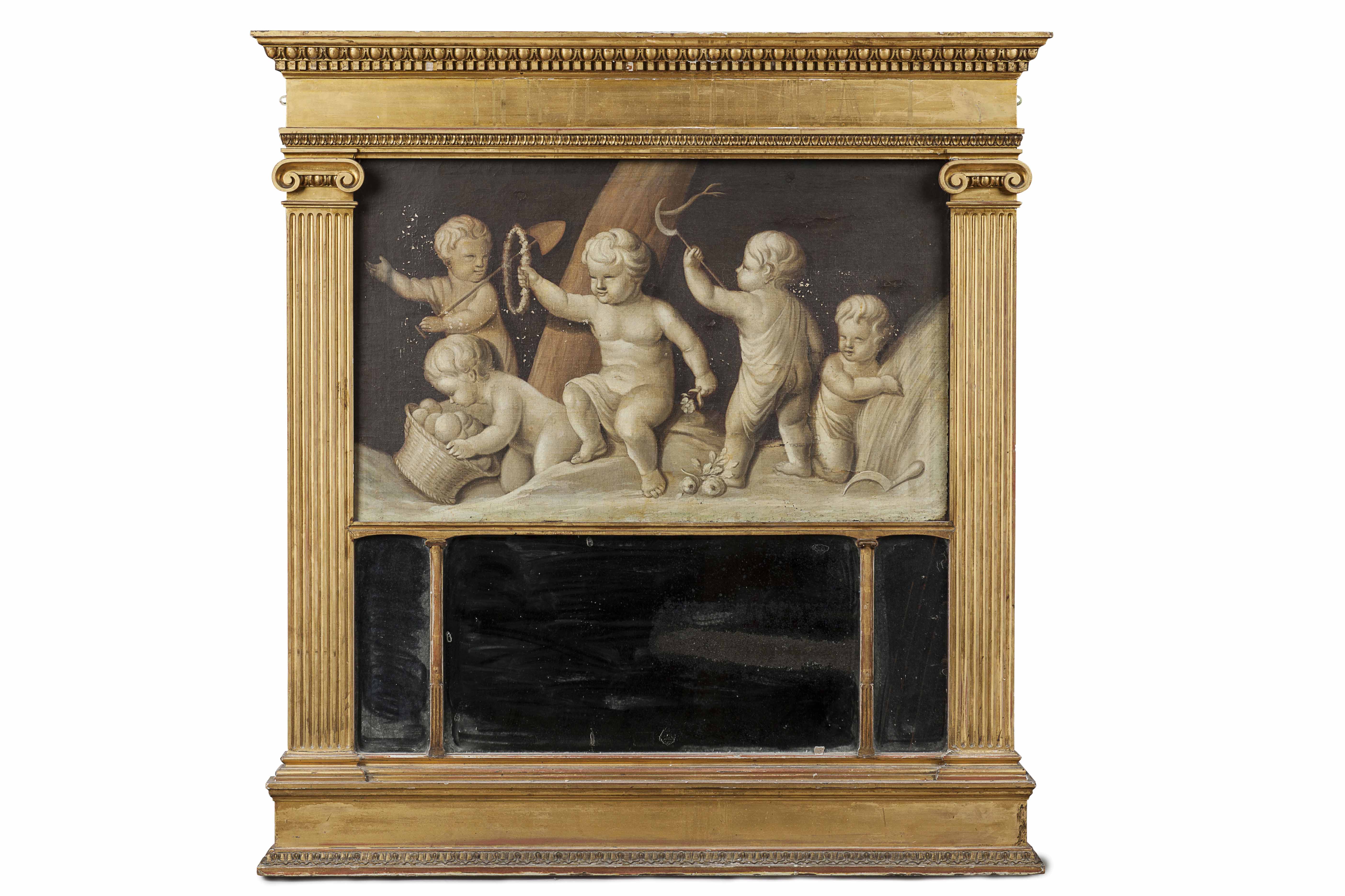 the egg and dart moulded cornice above a plain cornice above an 18th century painted panel and triple mirror plate flanked by fluted Ionic pilasters on a moulded base